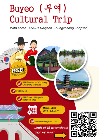 This is a FREE trip offered by the people at Buyeo County. They will provide a free bus, lunch, and tour of the historical sites in Buyeo. The trip is limited to 15 attendees. As DCC members, you have first dibs on the trip. Please sign up by Sunday, August 24th. On Monday, August 25th, we'll advertise the event on our website and social media. The people at Buyeo County would like a list of attendees by September 1. Please note that the trip organizers will require us to be insured while riding on the bus. To do so, attendees will need to provide their Alien Card #. Once again, here is the link to sign up! https://forms.gle/TSvcenFj8yWSbXKn9