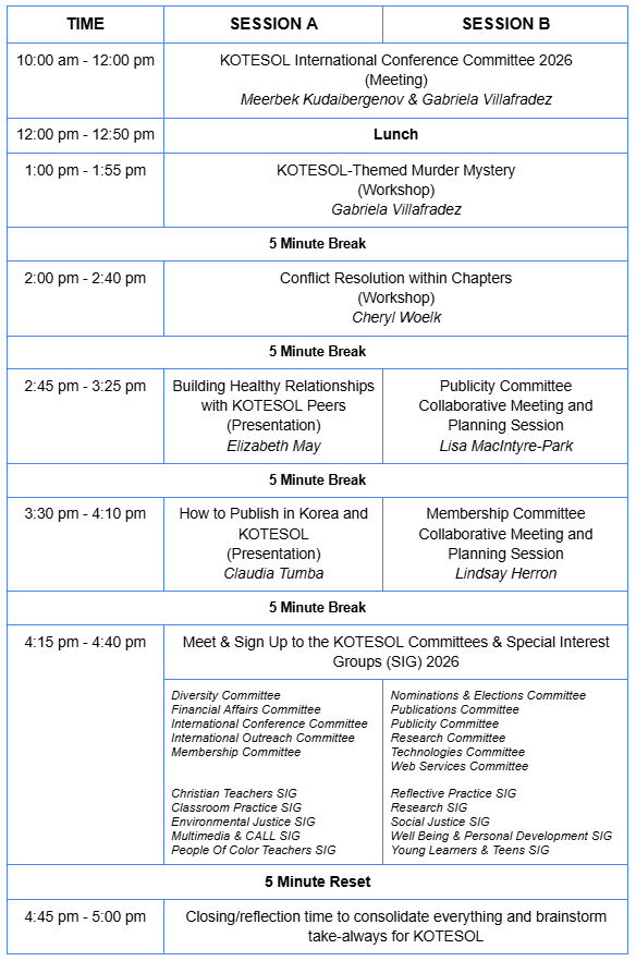 This year, we are excited to host a packed weekend of presentations, workshops, and planning sessions to strengthen our organisation and voice in the ESL community in Korea. You can find the full schedule below.