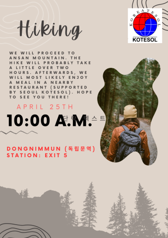 We will proceed to Ansan Mountain. The Hike will probably take a little over two hours. Afterwards, we will most likely enjoy a meal in a nearby restaurant (supported by Seoul KOTESOL). Hope to See You There!