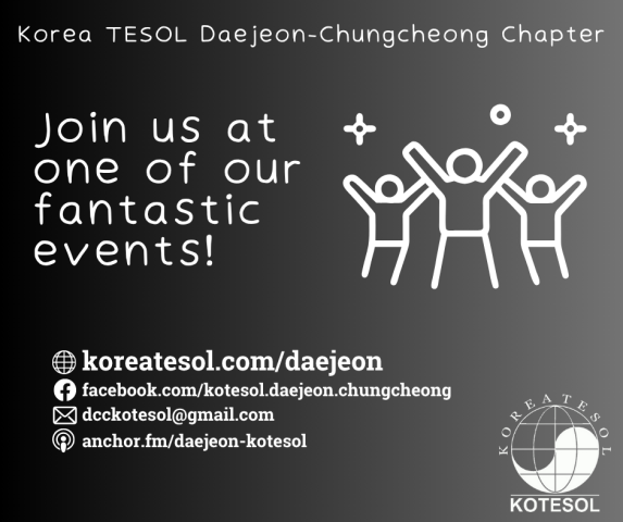 Welcome to the Daejeon-Chungcheong Chapter of KOTESOL! The purpose of our chapter is to  provide leadership, professional development, scholarship and networking in the field of English education, to stimulate teaching and learning and the dissemination of information and research in this field, and to facilitate crosscultural understanding between stakeholders in the areas of the Chungbuk and Chungnam provinces of Korea, including the major centers of Daejeon, Cheongju, Sejong and Cheonan-Asan.